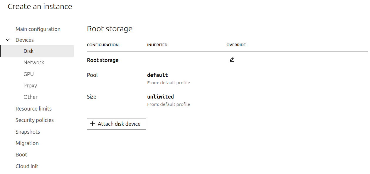 From here, you can override the pool and size of the root storage by editing their respective fields.